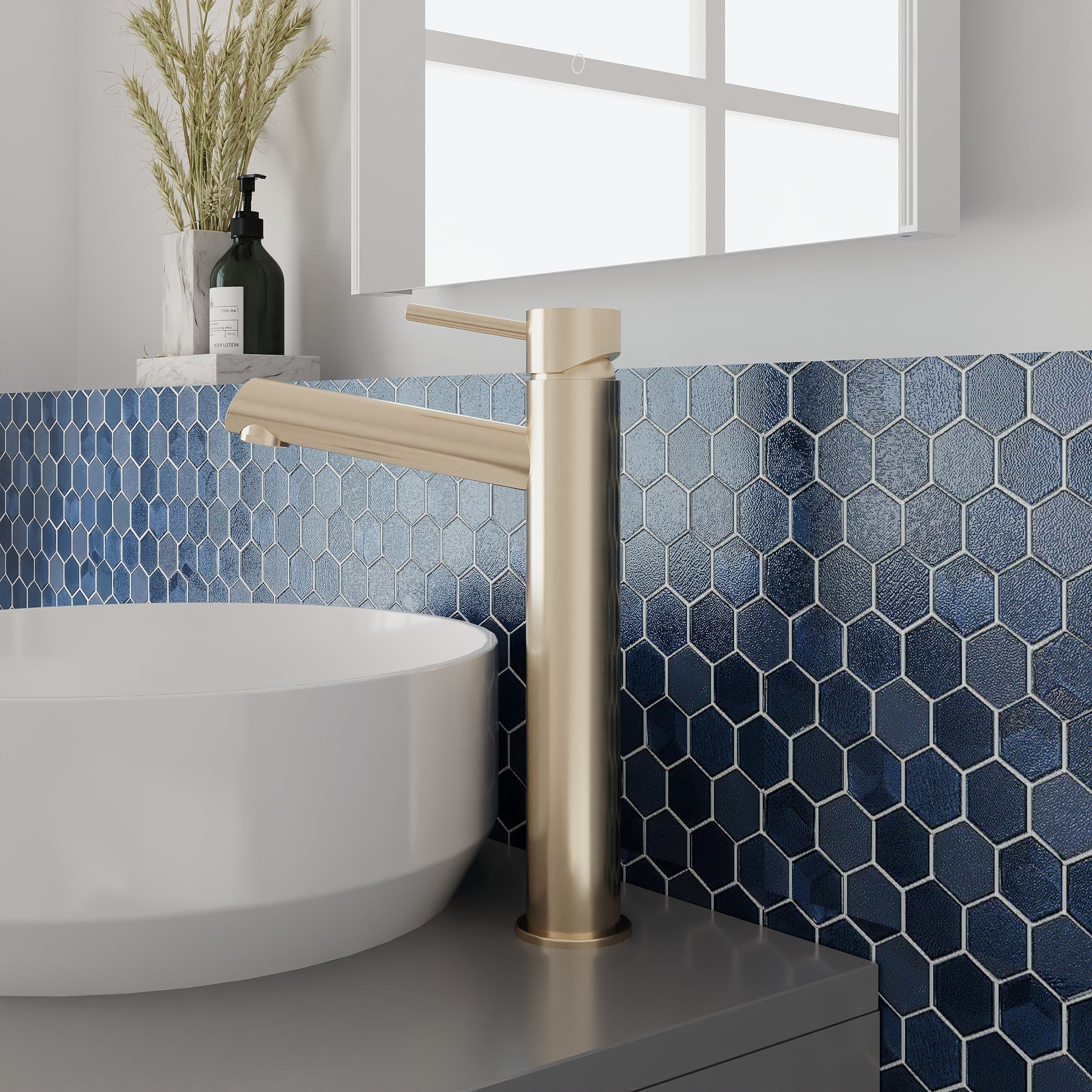 - Sleek high-rise design makes this tap perfect for use with countertop vessel basins