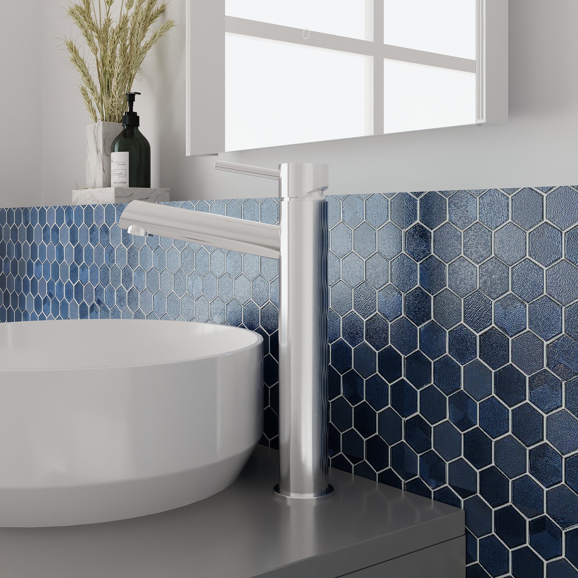 - Sleek high-rise design makes this tap perfect for use with countertop vessel basins